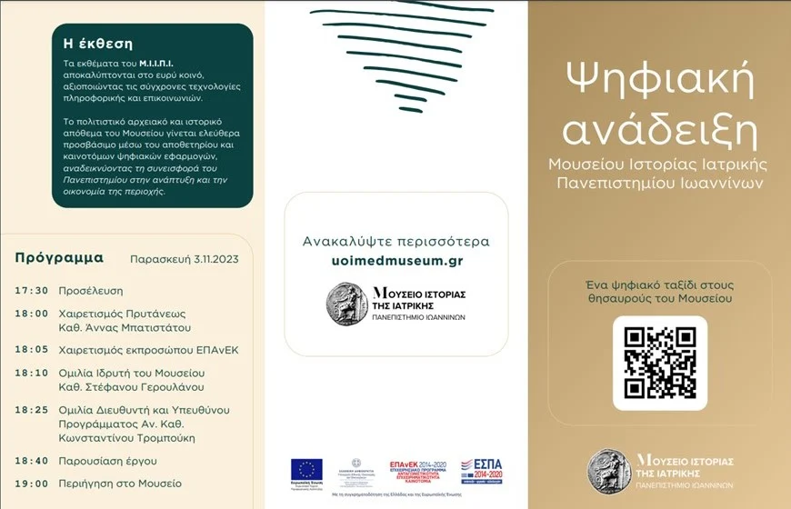 Το Πανεπιστήμιο Ιωαννίνων αποτείνει πρόσκληση για την εκδήλωση παρουσίασης των αποτελεσμάτων της πράξης, «Ψηφιακή Ανάδειξη, αξιοποίηση και προβολή του πολιτιστικού αρχειακού και ιστορικού αποθέματος του Μουσείου Ιστορίας της Ιατρικής του Πανεπιστημίου Ιωαννίνων».
