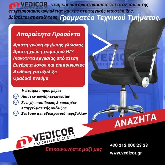 Η VEDICOR προς αναζήτηση Γραμματέα Τεχνικού Τμήματος